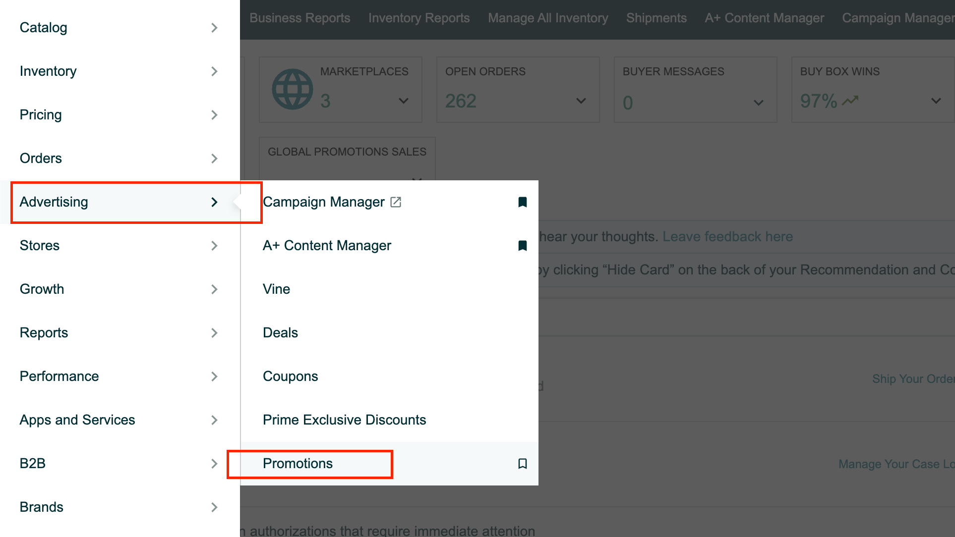 1. Go to the side menu of Seller Central and select "Advertising". Then, select "Manage Promotions" from the Drop-Down Menu.