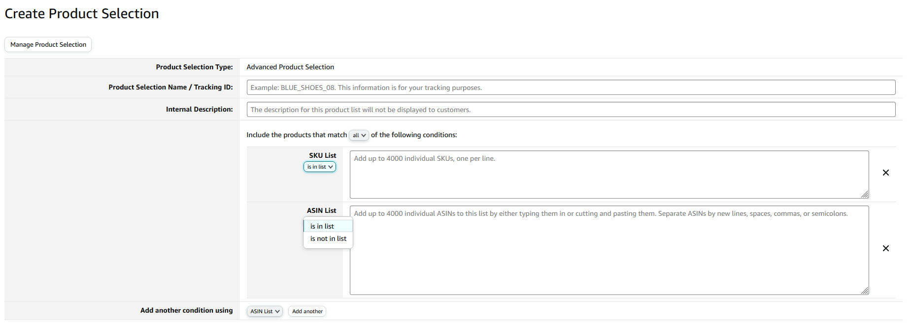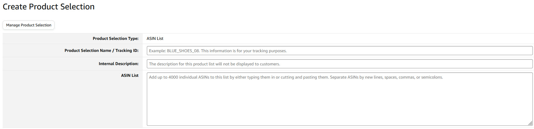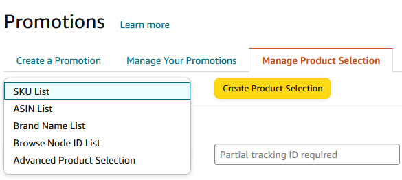 To create a Product Selection, prepare a list of your ASINs or SKUs that fit into one of the Product Selection Types such as the SKU List, ASIN List, Browse Node ID List, Brand Name List, or Advanced Product Selection.