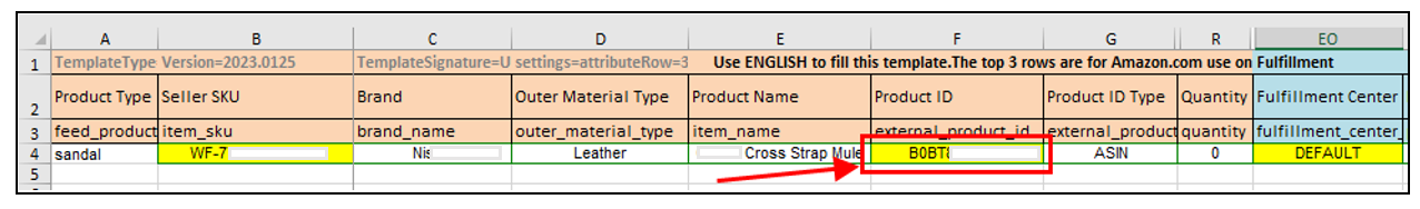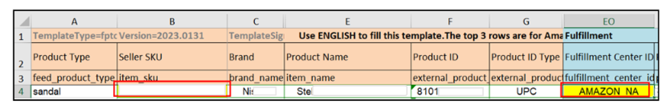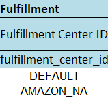 4. Under the Fulfillment Center ID, use AMAZON_NA (NA for North America, CA for Canada, MX for Mexico, etc) if it’s Fulfilled by Amazon and DEFAULT if it’s Fulfilled by Merchant. If it’s left blank, it will automatically be set to FBM.