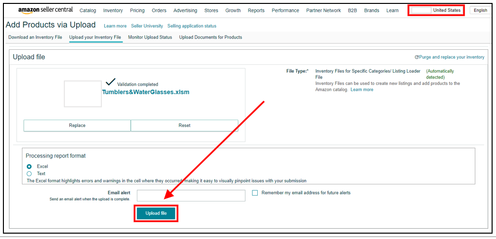 7. Save the flat file and upload it on Seller Central. Go to Inventory > Add Products via Upload > Upload your Inventory File. Refresh the page first before attaching the file and make sure you’re on the right Amazon store. Then click Upload file.