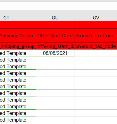 2. Open the flat file template. Cells that are highlighted in red are required fields although we can still create the listing without filling in each cell. You’ll know which columns should have values if you fill out the Product Type first. The columns required will be highlighted in red; this will vary depending on the category.