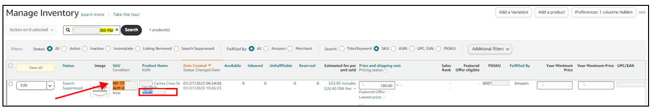 12. If the listings are showing up as suppressed, wait for a few minutes and then refresh the page. If it is still suppressed by then, click the suppressed button beside "Edit". It would route to a page that would tell you the information you need to edit to lift the suppression. Supply it, and save.