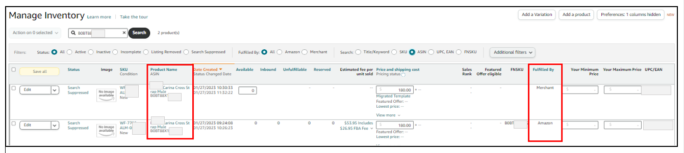 11. After uploading, go to Manage All Inventory and search the ASINs to verify if two listing offers (FBM and FBA) are reflected.