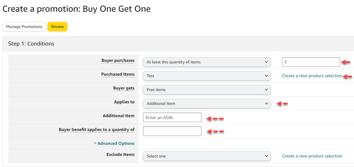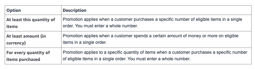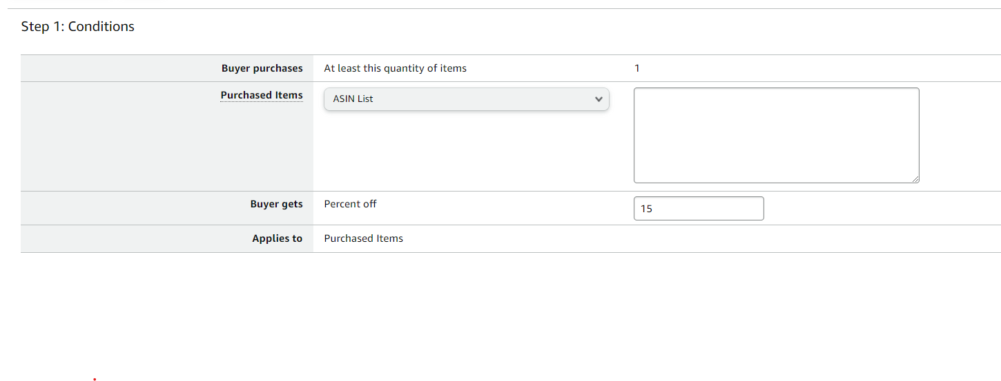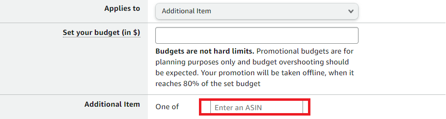 Applies to - Purchased Items/Additional Item - A promo discount is applied to the purchased items or to an additional Item. If an Additional Item is selected, specify the ASIN of the Additional Item.