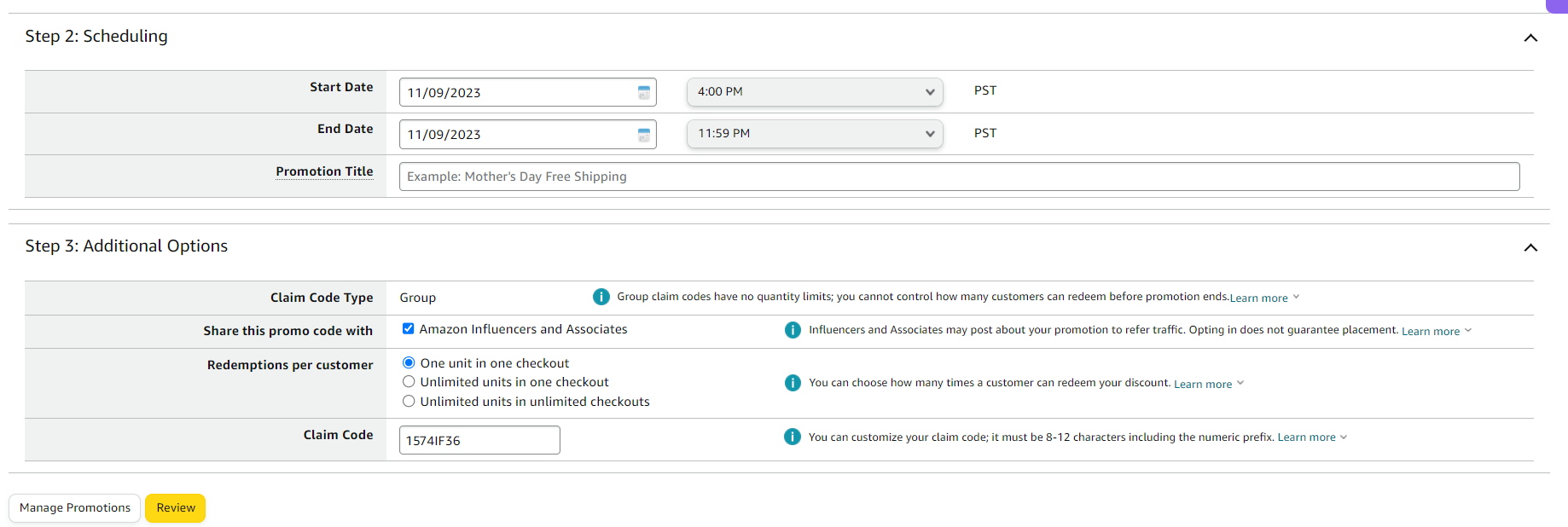 Unrestricted: Be extremely cautious before choosing this option, especially when you’re using a “group” claim code. This option means your promotion can be stacked along with other promotions that are running for your products. This could result in you giving multiple discounts for one order, and if you have Group promo codes, people can place unlimited orders.