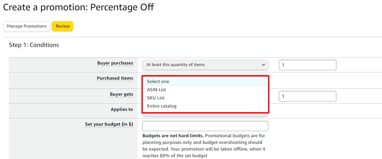 Purchased Items - If the promotion encompasses the entire catalog, please choose it from the dropdown menu. Alternatively, if the promotion does not cover the entire catalog, you can select specific SKUs or ASINs to include in the promotion.