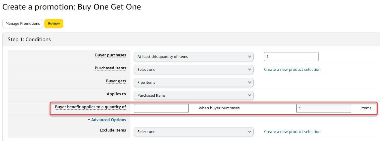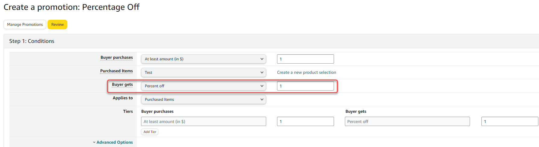 Use Advanced options to set up a promotion with a tiered discount structure to encourage customers to buy more because they get a better discount (no Buy Box impact). To discount single-unit purchases, consider implementing a limited-time Sale Price (impacts Buy Box).