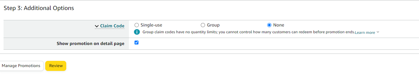 Group: Ideal if you want to sell out your inventory. Through this option, you can customize your claim code combinability as well. This can be risky if somebody posts the claim code on a social media platform if you have limited inventory intended for the promotion. You also have the option here to display the promotion on the PDP.