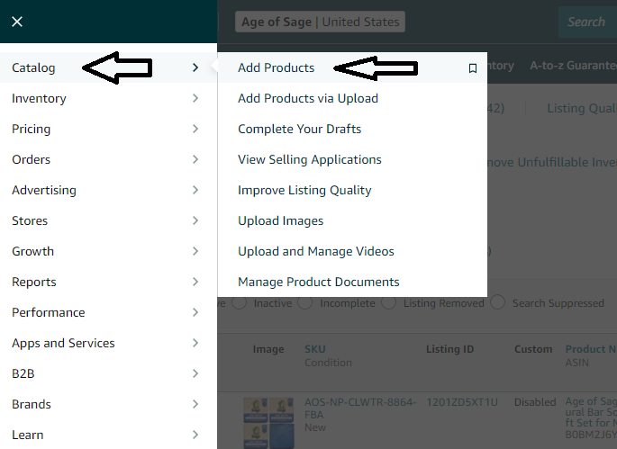3. Go to the "Catalog" on the top menu of Seller Central and select "Add Products" from the options.