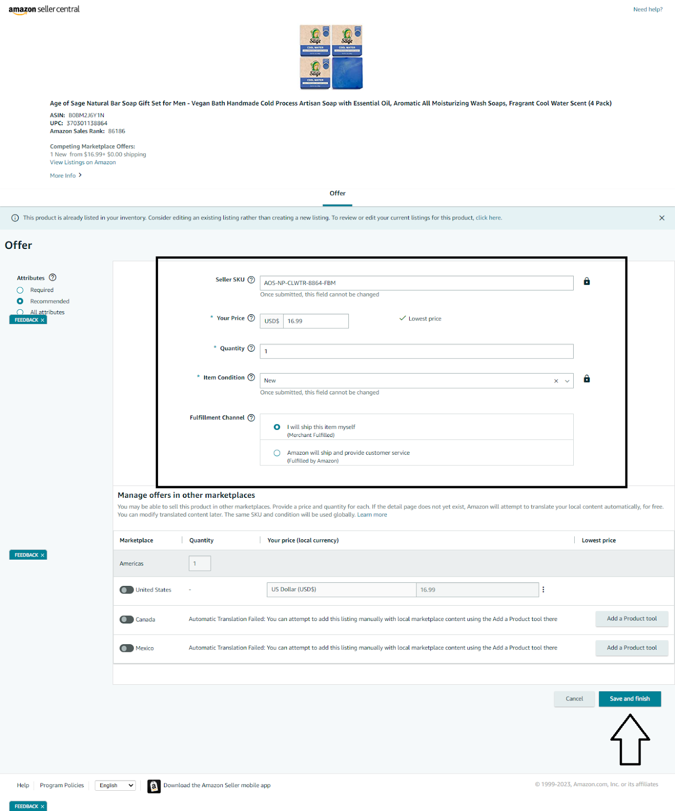 8. On the "Offer" tab of the next page, set the SKU to be different from the current FBA SKU, such as by adding FBM" before or after the standard SKU to indicate it's Merchant or Seller Fulfilled.