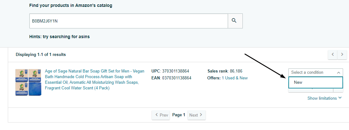 6. To the left of the product, select "New" from the dropdown menu for condition.