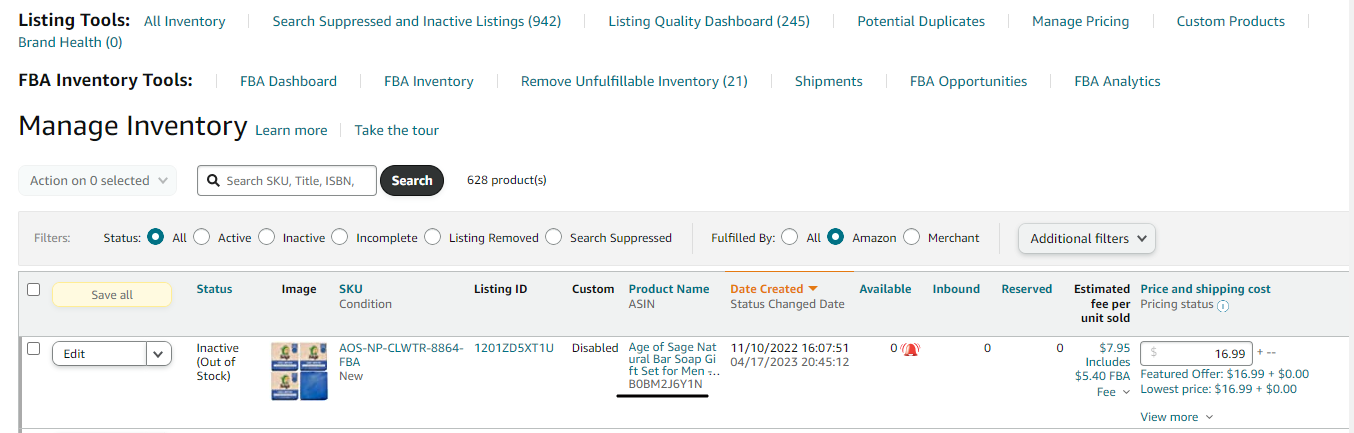 15. Once your new listing is processed, it should appear at the top of the table of SKUs on the "Manage Inventory" page.