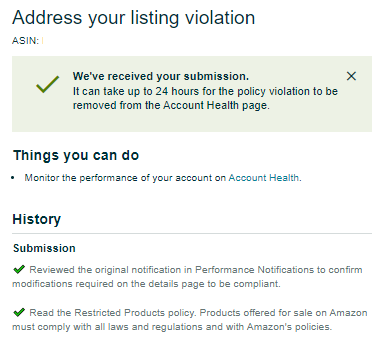 - If you’re confident that everything is set, go to Performance > Account Health > Restricted Product Policy Violations > Look for the ASIN > Appeal > Check the 2 boxes and Submit. Wait 24 hours before the listing gets reinstated.