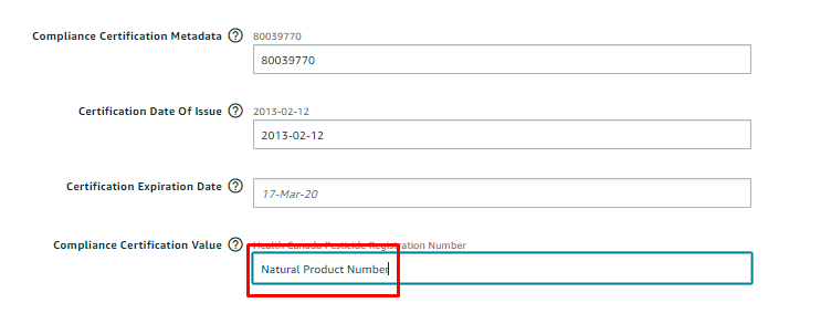 - Go to Inventory > Manage Inventory > Look for the yanked ASIN > Edit > Compliance > Put the NPN in Compliance Certification Metadata > Fill out the Certification Date Of Issue > Compliance Certification Value = Natural Product Number > Save and Finish