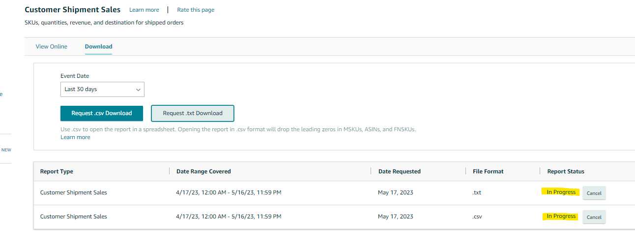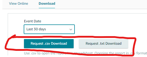 4. Click the “Request .csv Download” button to download the report in an Excel format or click the “Request .txt Download” button to download the report in a text format.