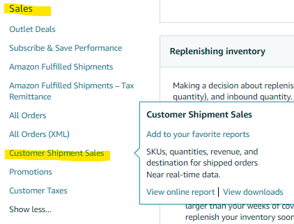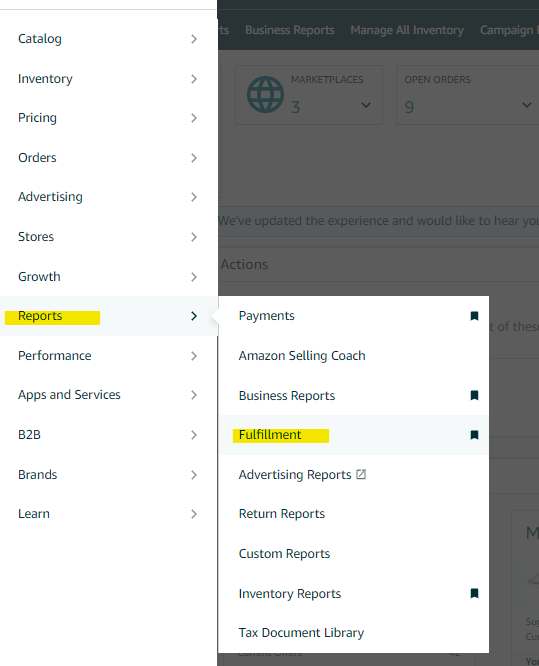 1. From the Seller Central home page, click the 3-line bars located on the left side. Then, select "Reports" and choose "Fulfillment."