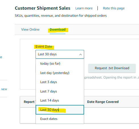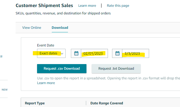 3. On the Customer Shipment Sales page, click on the "Download" tab. Select the “Event Date” or choose “Exact Dates” and enter the “From” and “To” dates respectively from the calendar icon to the right of each.