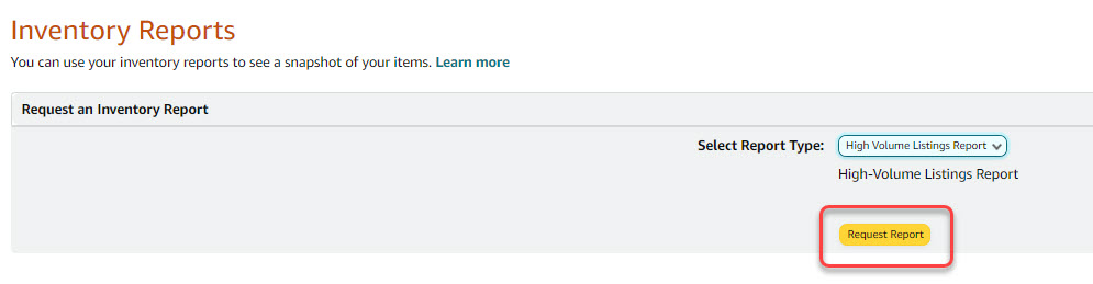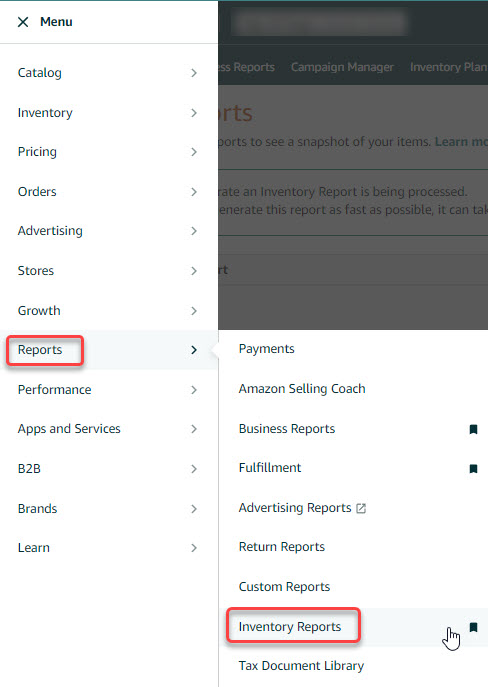 1. To obtain the report, access the “Reports” tab on the top menu of Seller Central and select “Inventory Reports” from the Drop-Down Menu.