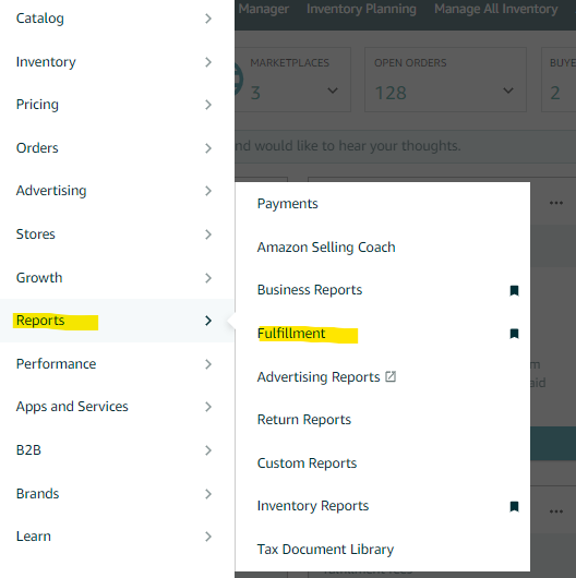 1. Go to the "Reports" tab on the top menu of Seller Central and select "Fulfillment" from the drop-down menu.