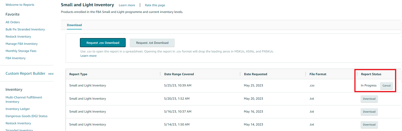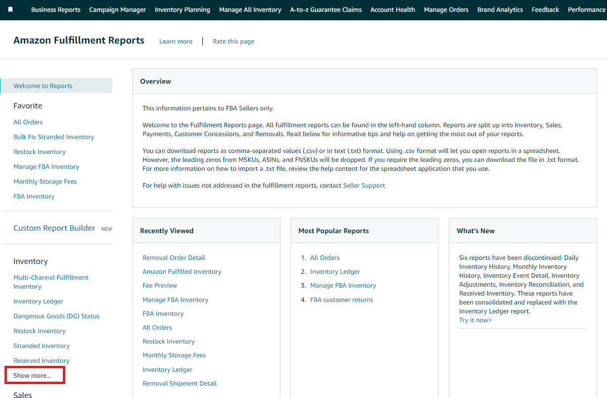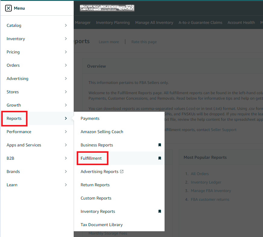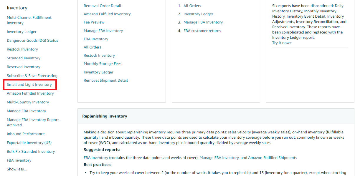 - To generate a Small & Light Inventory Report, go to the Menu icon on the upper-left of Seller Central and select Reports then Fulfillment.