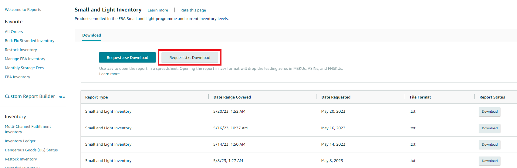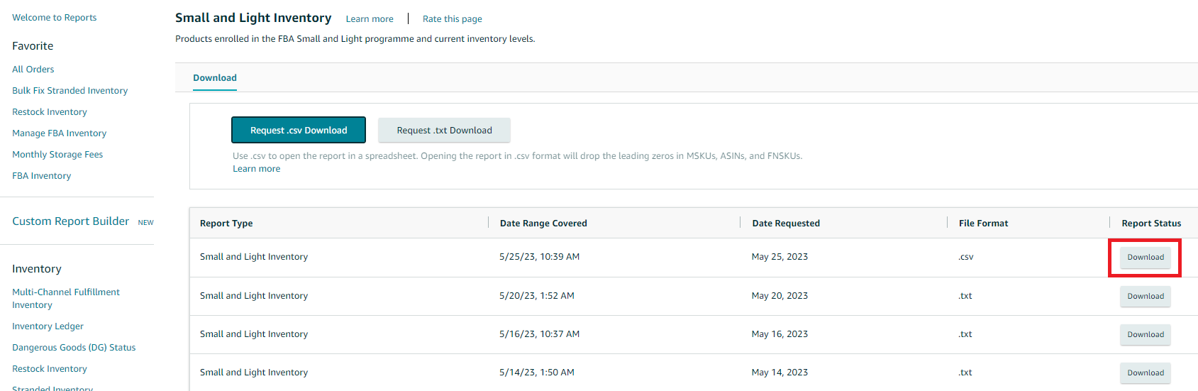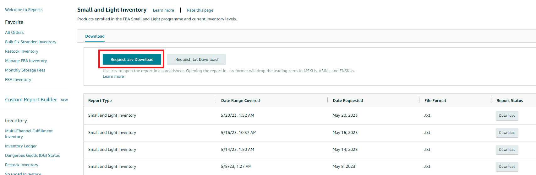 3. On the next page, you can download the report in Excel format by clicking on the Request .csv Download button.