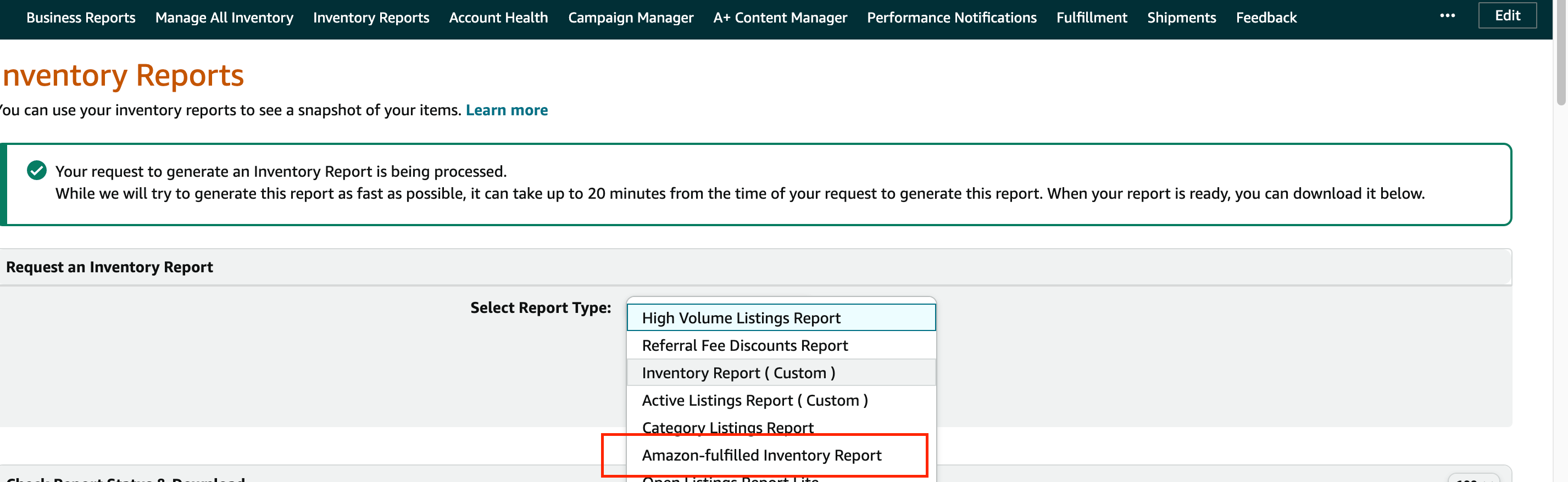 Objective: This SOP is to guide users in downloading an Amazon Fulfilled Inventory Report. By following this SOP, users can assess their inventory levels for better stock management and fulfillment strategies.