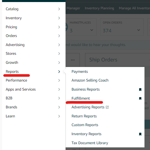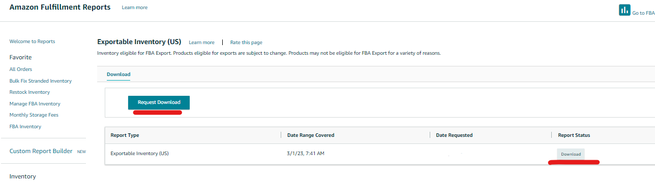 2. From the Amazon Fulfillment Reports page, go to Inventory ➡ Show more ➡ Exportable Inventory (US)