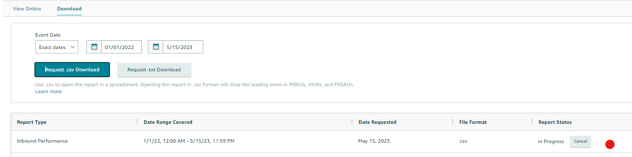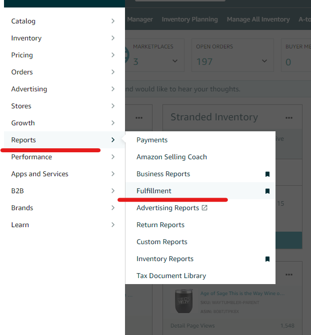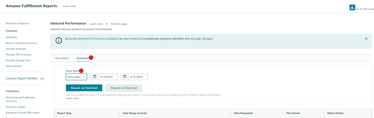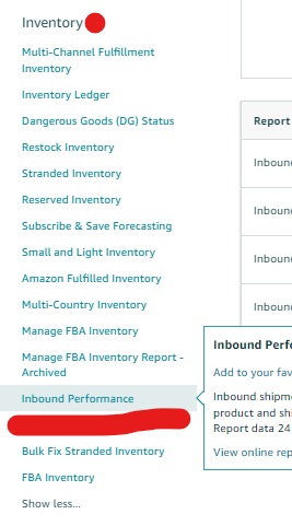 2. From the Fulfillment reports page, go to Inventory → Inbound Performance
