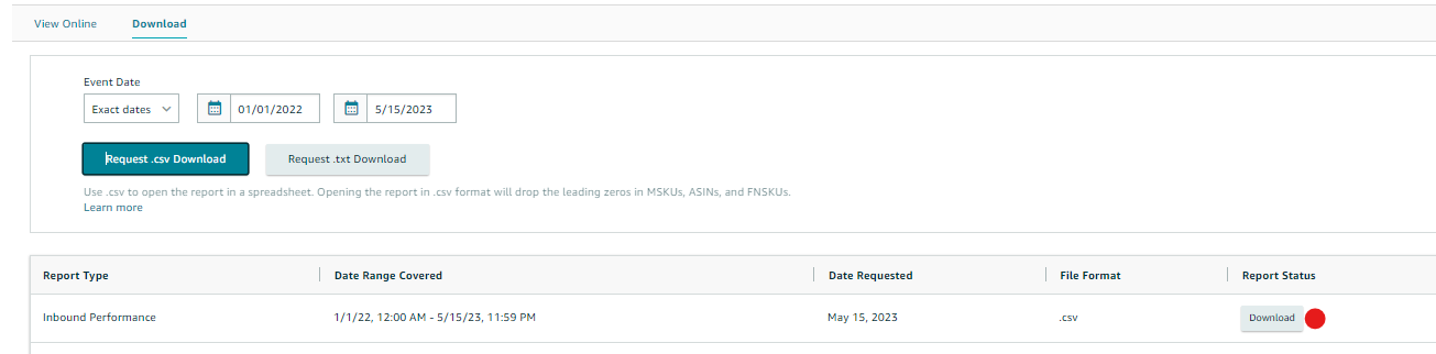 4. Click on the "Request .csv Download" button, if you want to download the report in an Excel format, and click on the "Request.txt Download" button, for a text format.