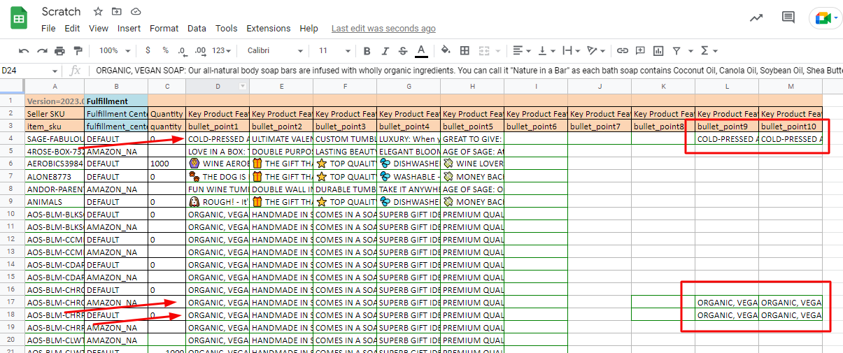 4. The usual number of bullet points is five. Check if there are copy values in bullet_6, bullet_7, bullet_8, bullet_9, and bullet_10 per SKU. Here is an example screenshot that will help you quickly determine whether the listing contains repeated bullet points.