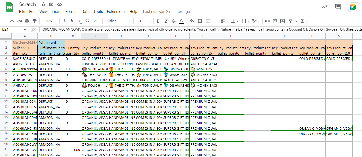 3. Open the CLR or Category Listing Report then, create your Google sheet tracker and copy all bullet points columns (BULLET 1 - 10) together with the SKU, Fulfilment Center, and Quantity. (so you can go ahead and perform a partial update if needed).