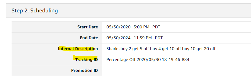 5. Make sure to update the Tracking ID and Internal Description in "Step 2: Scheduling" for your new Percentage Off Promotion to avoid confusion with the original.