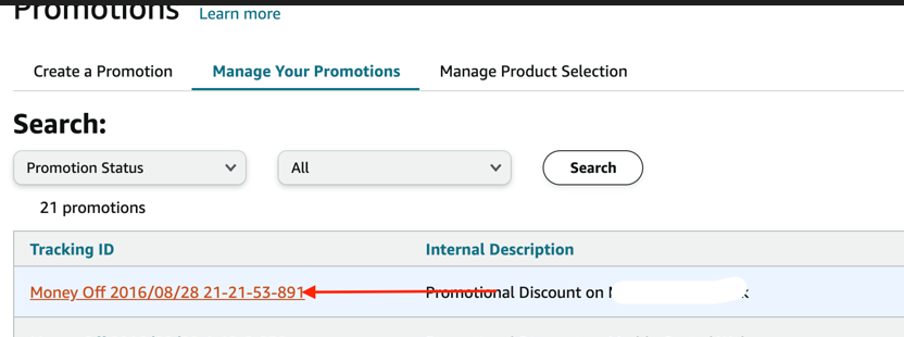 3. Click on the Tracking ID of your Percentage Off Promotion to open it up or click the "View" button to the right of the Promotion you want to edit.