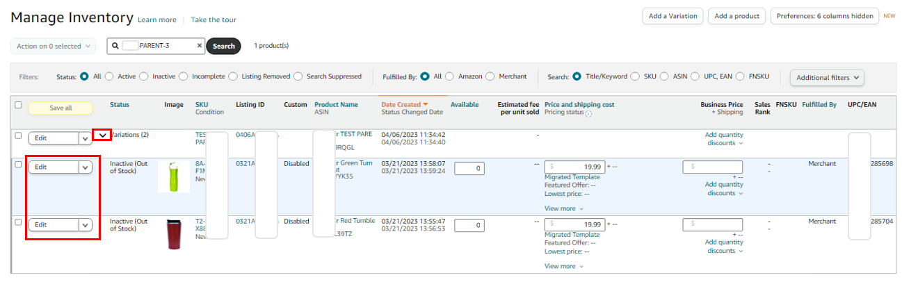 2. Click the arrow next to the parent ASIN to view its variations.