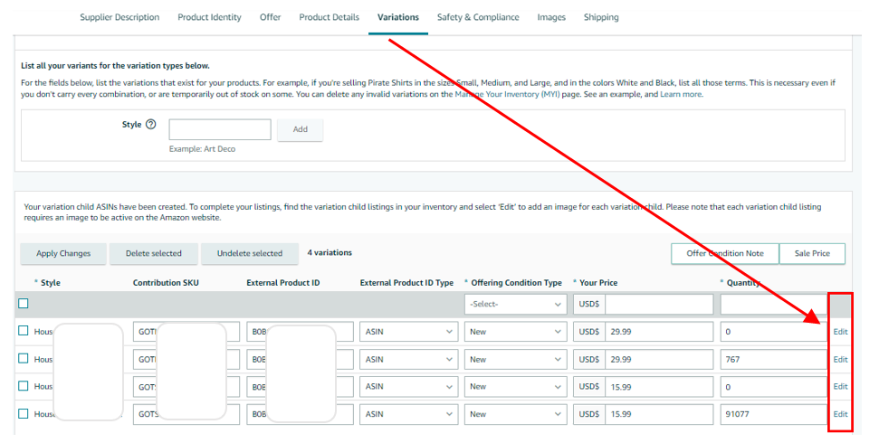 6. If a field cannot be edited in the variation table, you will need to click on the child ASIN and make the changes in the Product Listing Edit Page.