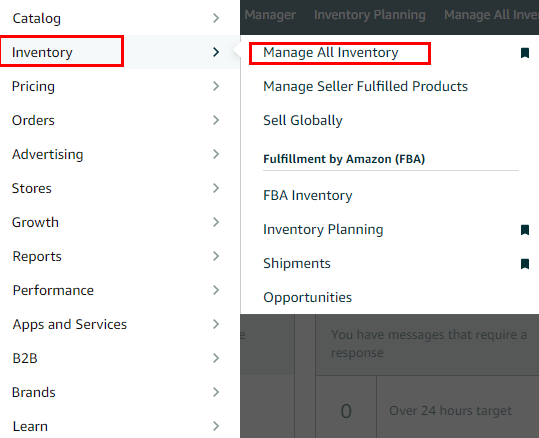 1. To make manual changes to variations, go to the “Inventory” tab on the top menu of Seller Central and select “Manage All Inventory.”