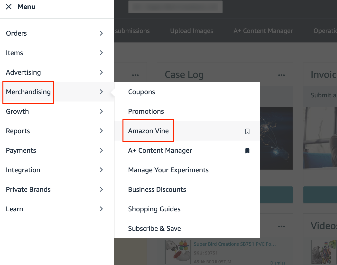 - From the top menu of Vendor Central, go to the "Merchandising" tab and select "Amazon Vine" from the drop-down menu.