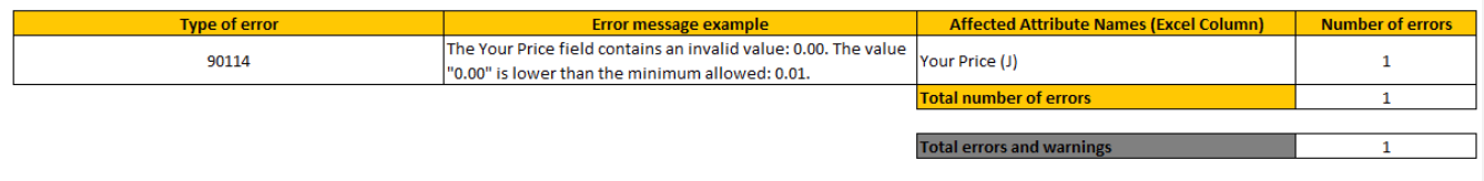 Search for the names of affected attributes in the Excel column. Typically, errors are indicated in a dark yellow color, and the precise columns are specified in the feed processing summary tab