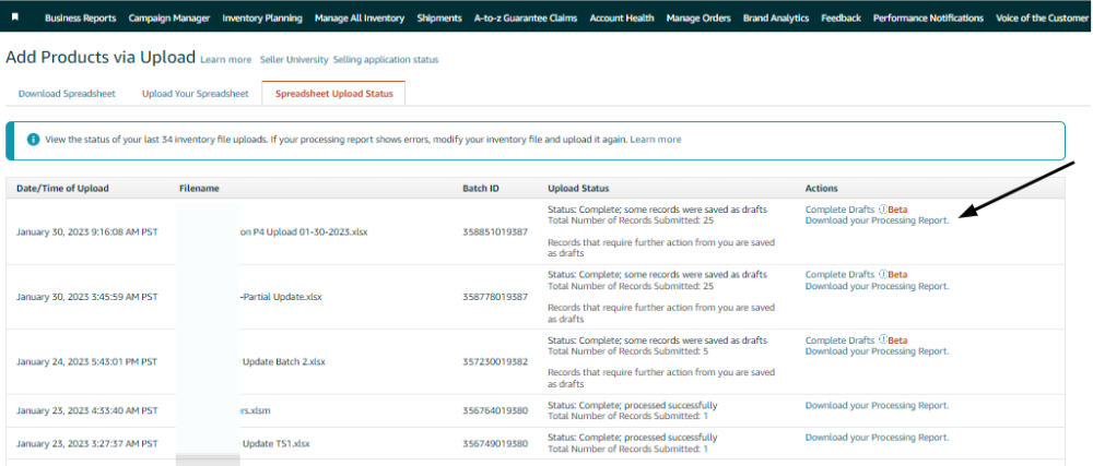 For unsuccessful uploads. Download the flat file report by clicking on the Download your Processing Report link.