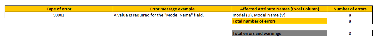 3. Below is a screenshot of the processing report with the 99001 error. Locate all cells in the template that were highlighted in orange. This would tell you that the value stored in these fields is either invalid or missing.