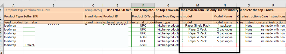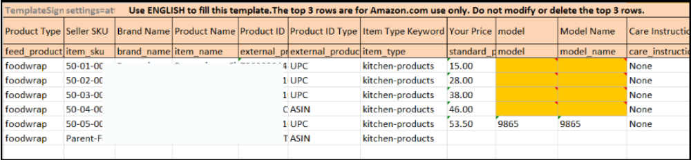 In this example, the category “Home & Kitchen › Kitchen & Dining" was used, wherein the Model and Model Name attributes (highlighted in orange) were required values but were not filled out on the initial flat file load.