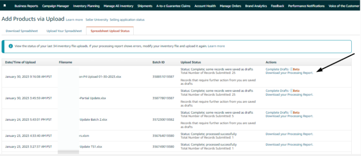- For unsuccessful uploads. Download the flat file report by clicking on the Download your Processing Report link.