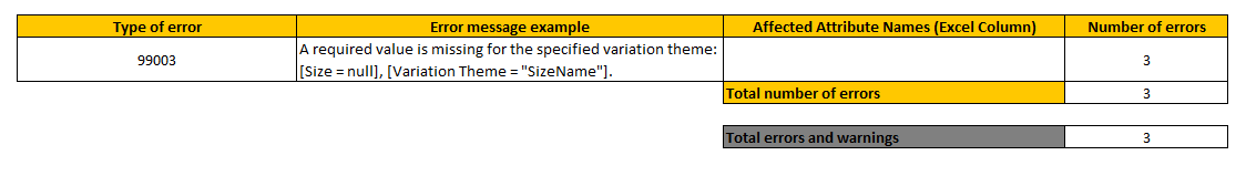 This error occurs when you are setting up a parentage, but a required value is missing for the specified variation theme. The screenshot below is an example of a processing report error message showcasing the 99003 error.