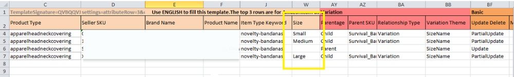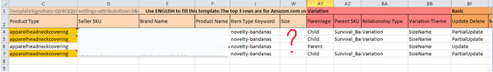 The example below shows a parentage setup with a SizeName variation theme. However, the Size column of child listings is not filled out.