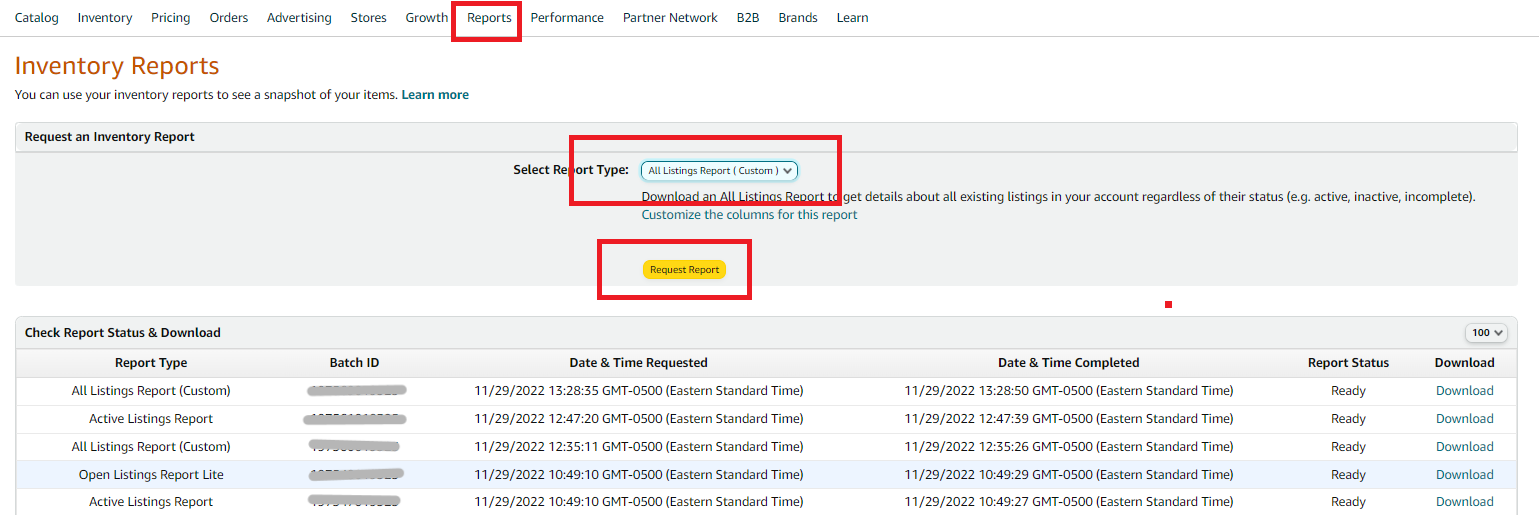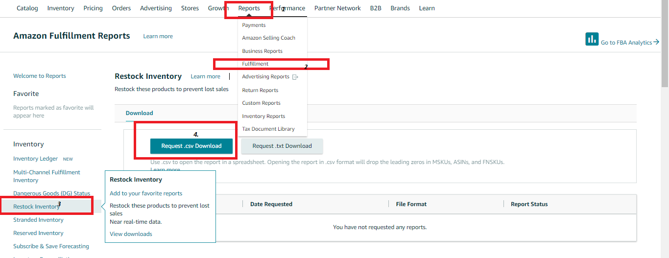 c). Reports → Fulfillment → Restock Inventory → Request CSV Download