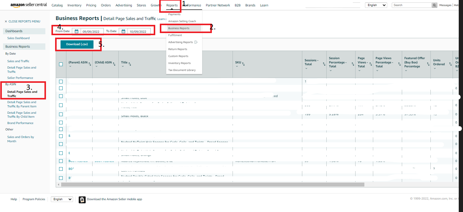 d). Reports → Business Reports → Detail page sales and traffic by ASIN. Download Business reports for the past 2 weeks, 30 days, 60 days, and 90 days of sales. (Remove any B2B report data)