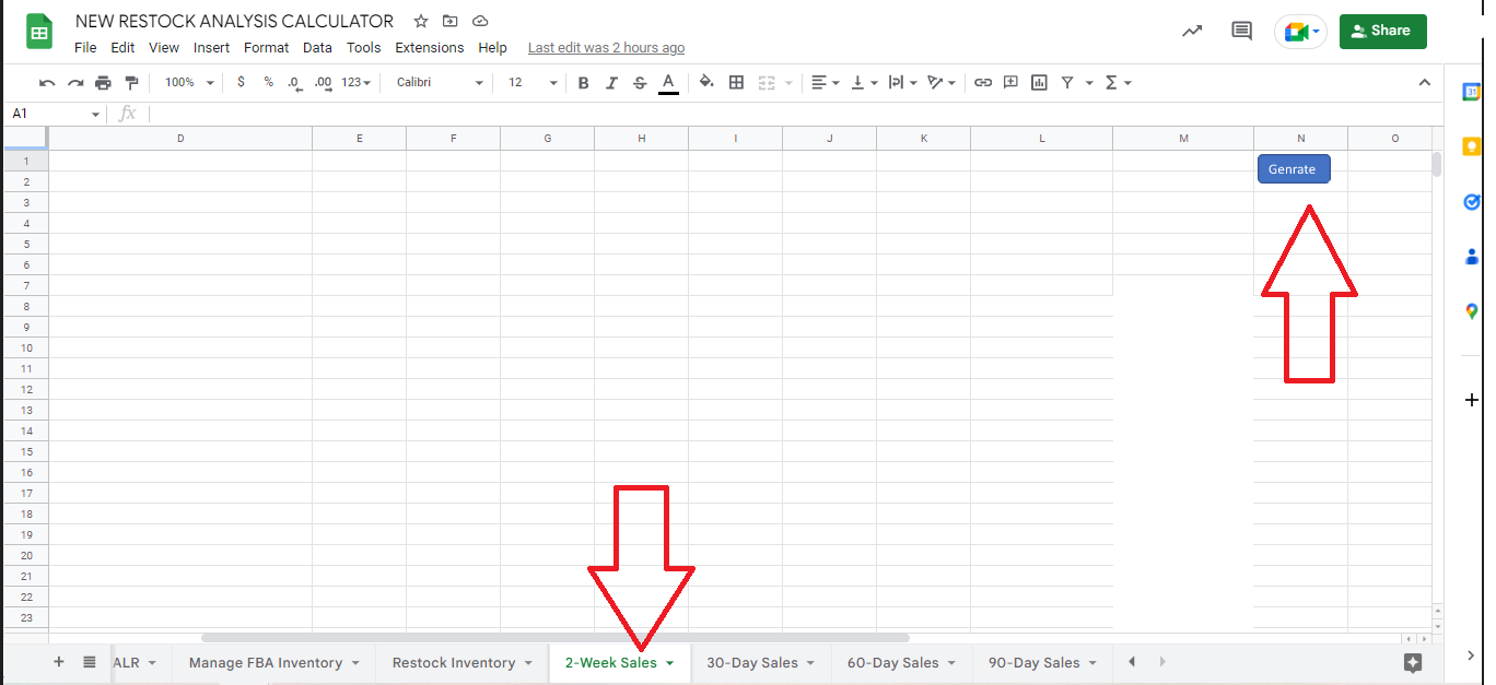 4. Once the reports have been placed in each corresponding tab, click the GENERATE button on the 2 weeks sales tab. A pivot table is created for business reports to add all units ordered as some accounts have duplicate SKUs with different units ordered.