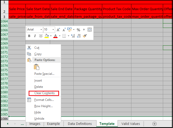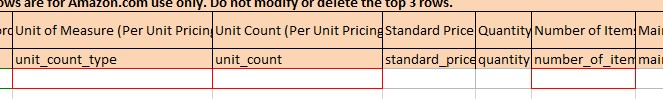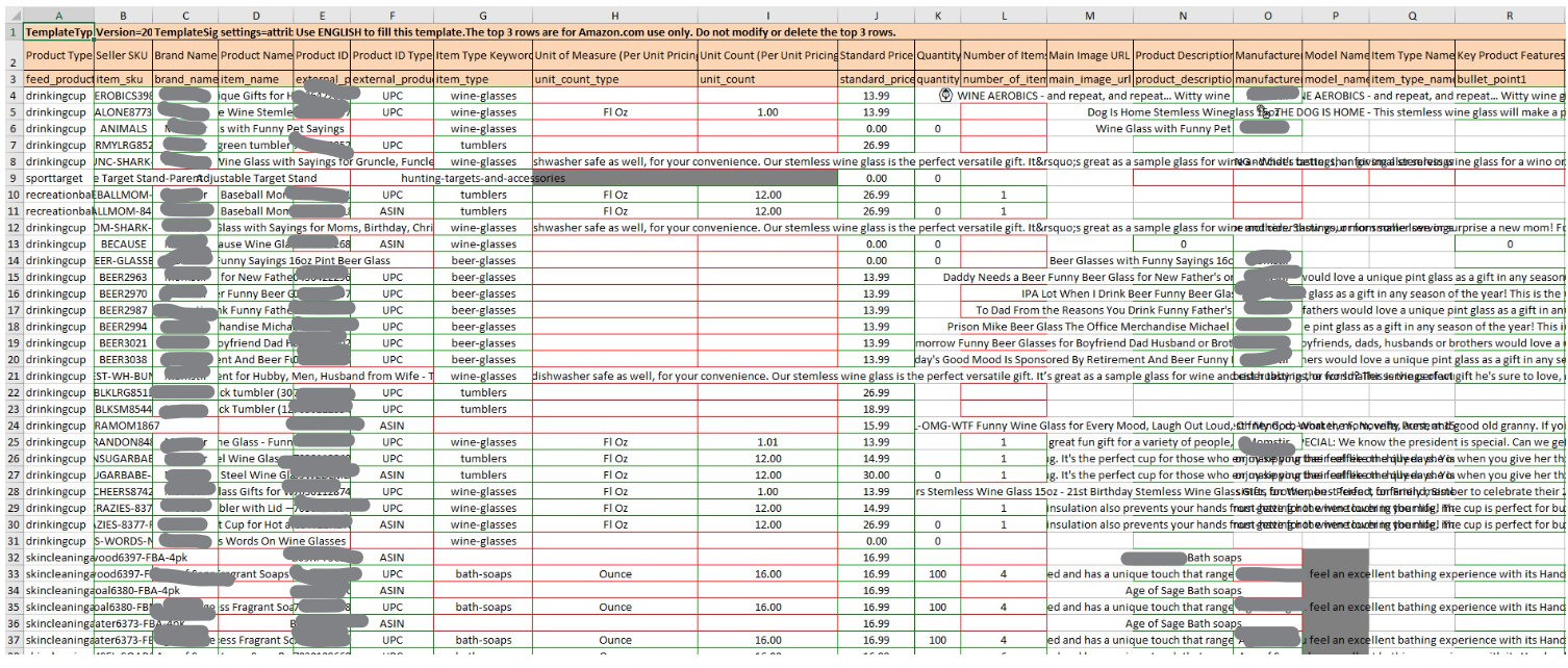 8. The cells highlighted in red are required and should have values. The CLR only picks up the values inside the seller contribution box and not the values on top of it (what’s currently saved on Amazon). This is why the cells for these columns are blank. Check the backend and use the values on top of the box. If these data are not found on the backend, please ask the brand manager.