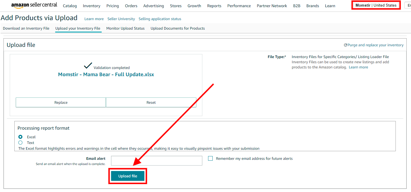 20. Go to Catalog> Add Products via Upload > Upload your Spreadsheet. Refresh the page first before attaching the file and make sure you’re on the right Amazon account. Then click Upload file.