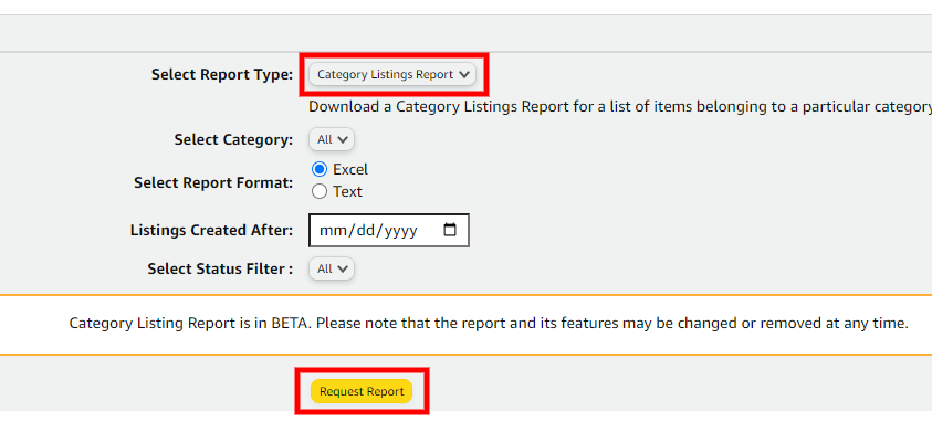 1. Download the Category Listings Report (CLR). Go to Reports> Inventory Reports. On the dropdown menu, select Category Listing Report then click Request Report.